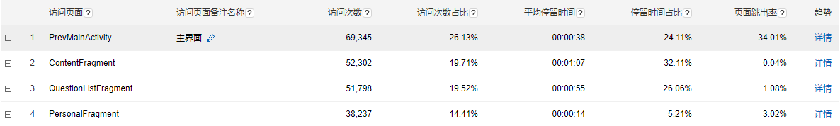 比如下图是我负责的一个产品的页面用户数据,根据相关页面的停留时长,我可以确保用户主要的使用页面是什么,由此我会对该页面进行更加优秀的用户体验设计。如果老板要我植入广告,那么我知道把广告放在哪个页面会被更多的用户所知晓,也可以间接提高CPC,从而提升产品的赚钱能力。