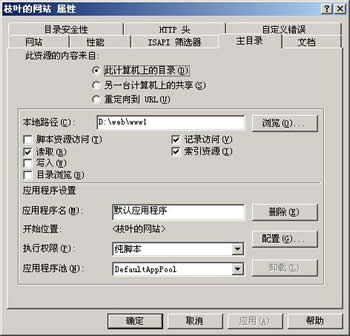 网站访问权限是限定用户访问网站时的权限,“读取”是必需的,“运行脚本”可以让站点支持ASP,其它权限可根据需要设置。