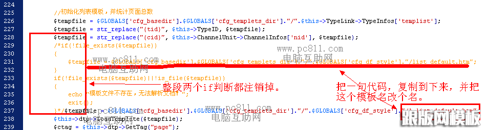 第11步:找到第229行中的if到第237行中的}号,把这段代码使用/和/注销掉,并把第231行中的代码复制一下,并复制到237行的*/后面,然后把/list_default.htm改个名。