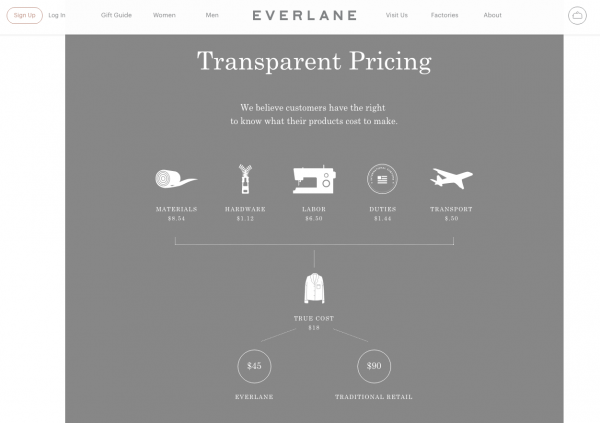 (EVERLANE给每一件衣服都标明了成本,标价45$的衬衣,成本为18$,商场零售90$。图片来源:https://www.everlane.com)