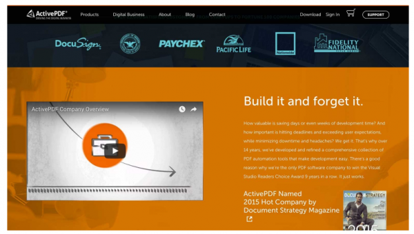 说服用户,需要使用创意的方式呈现有力的数据。ActivePDF在官网中的文案是:为什么我们是唯一连续9年赢得Visual Studio读者选择奖的PDF软件公司呢?文案旁展示了一个解释性的视频。这个广告奏效了,客户量激增。